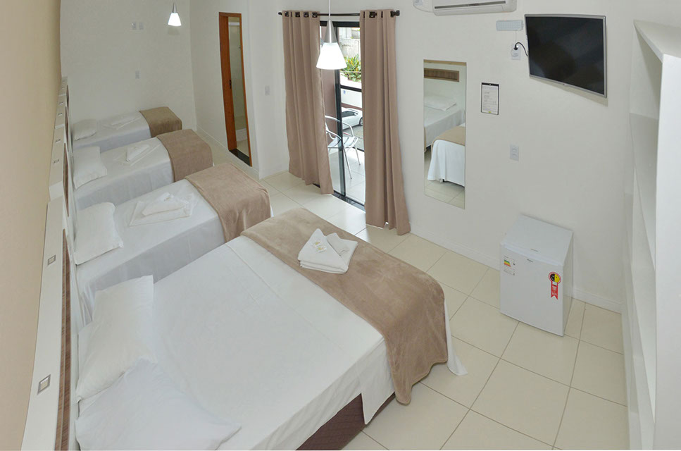 Em um total de 24 Quartos amplos e confortáveis, para casais e famílias de até 7 pessoas, Ar-Condicionado Split, TV com parabólica HD, Camas Box e Internet Wireless Grátis em todo o local. Todos nossos apartamentos possuem secador de cabelo e acesso exclusivo à cadeirantes.